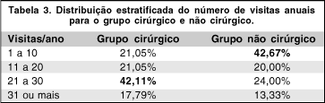 No grupo CG, 42,11% dos pacientes compareceram ao ambulatório entre 21 e 30 vezes em 12 meses. Já entre no grupo NC, 42,67% visitaram o ambulatório até 10 vezes no mesmo período (Tabela 3).