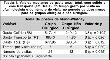 Estatisticamente foi encontrada diferença significante entre os grupos CG e NC quando comparados o gasto total estimado (p = 0,012), o gasto anual com transportes (p = 0,029), o tempo gasto por visita (p = 0,019) e o número de visitas por ano (p = 0,045). Quanto ao gasto anual com colírios não foi encontrada diferença estatística. A tabela 4 mostra estes valores acompanhados das respectivas medianas.