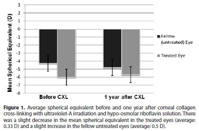 The preoperative (-6.0 ± 2.6 D) and twelve months postoperative (-5.6 ± 2.7 D) mean spherical equivalent (SE) had a slight improvement by an average of 0.33 D (P=0.004). In the fellow untreated eyes, mean SE increased by an average of -0.5 D (P=0.000). Figure 1 shows the mean SE before and 1 year after treatment in the treated and untreated fellow eyes.