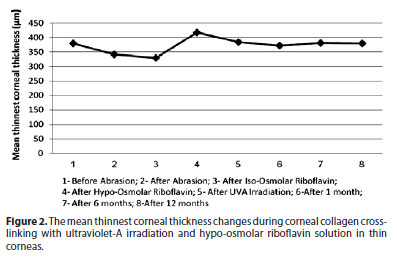 RESULTS: Mean preoperative thinnest corneal thickness was 380 ± 11 µm. After epithelial removal it decreased to 341 ± 11 µm, and after 30 minutes of iso-osmolar 0.1% riboflavin drops, to 330 ± 7.6 µm. After hypo-osmolar 0.1% riboflavin drops, mean thinnest corneal thickness increased to 418 ± 11 µm. After UVA irradiation, it was 384 ± 10 µm. At 1, 6 and 12 months after treatment, it was 372 ± 10 µm, 381 ± 12.7, and 379 ± 15 µm, respectively. No intraoperative, early postoperative, or late postoperative complications were noted.