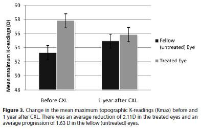 Twelve months after CXL, 12 eyes (66.6%) had no change in their BSCVA compared to preoperative data, and 6 eyes (33.3%) had an increase of 1 line on the log MAR scale (P=0.013). No eye lost any line of the BSCVA, however, 38.8% (7 eyes) of the fellow untreated eyes lost 1 line, and 5.5% (1 eye) lost 2 lines on the logMAR scale in their BSCVA (P=0.004).