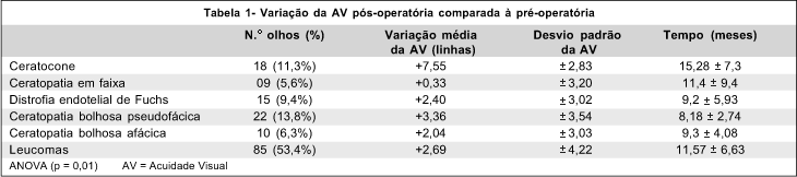 A indicação mais freqüente de CP foi o leucoma (53,4%), e a menos foi a ceratopatia em faixa (5,6%). A AV pré-operatória, medida pela tabela de Snellen ampliada, foi comparada à AV pós-operatória e, a evolução desta medida em linhas foi analisada para cada grupo, conforme mostra a tabela 1.