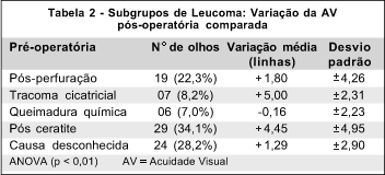 Os cinco subgrupos de leucoma foram também avaliados e os resultados são mostrados na tabela 2.