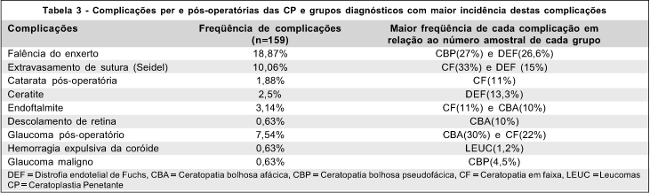 As complicações per e pós-operatórias são apresentadas na tabela 3. A falência de enxerto, extravasamento de sutura (Seidel) e o glaucoma pós-operatório foram as principais complicações.