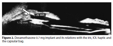 An ultrasound biomicroscopy (UBM) was performed on day 2 to evaluate the positioning of the implant in the non-dilated eye (Figure 3). Since there are reports of Surodex migration and remnants in the anterior chamber in the literature(8,10). In our study, the dexamethasone 0.7 mg implant was placed sutureless in the first four patients and there was a migration to the anterior chamber in two of them and a migration from the original intraoperative position in another one, almost reaching the visual axis (Figure 4). Because of this, the other 3 implants were sutured on the IOL haptic and remained stable throughout the follow-up.