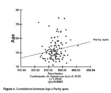 The mean pachy apex was 522.99 µm ± 24.15 (i.e., range: 463 to 605). Spearman's correlation test was not statistically significant (i.e., p=0.06, rs 0.16) (Figure 3).