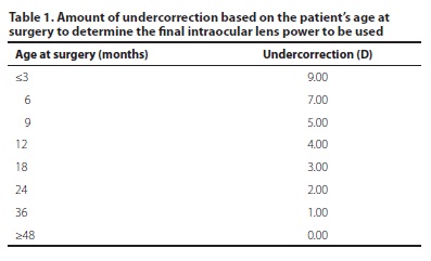 Preoperative intraocular pressure (IOP) measured with a calibrated Perkins applanation tonometer and central corneal thickness (CCT) were attained from the medical charts. These measurements had been taken before surgery, under general anesthesia. All surgeries were performed by one surgeon (M.C.V.) with a vast experience in congenital cataract surgery. A standardized surgical technique was implemented, which included phacoaspiration, posterior capsulorhexis, endocapsular tension ring implantation (endocapsular tension ring of 10/12 mm; Visiontech Medical Optics Ltda, Belo Horizonte, Brazil), anterior vitrectomy and primary IOL implantation. In all patients, a foldable, hydrophobic acrylic Type 7B IOL (Alcon, Fort Worth, USA) was placed in the capsular bag. This lens has an optical diameter of 5.5 mm and a total diameter of 12.5 mm. The IOL power was calculated based on a protocol created by one of the authors (M.C.V.)(5). The goal of this protocol is emmetropia at 4 years of age. Briefly, the IOL power is first calculated using an A-scan (DGH 4000B, DGH Technology, Inc., Exton, USA) and the Holliday II formula. Depending on the age of the child at surgery, a specific amount of undercorrection determines the final power of the IOL that will be placed (Table 1). If the child is pseudophakic in the fellow eye or has unilateral cataract, the refraction of the fellow eye is also taken into consideration to avoid anisometropias.