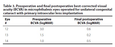 CONCLUSION: Primary intraocular lens implantation in congenital cataract surgery in microphthalmic eyes resulted in a significant best-corrected visual acuity improvement with no intraoperative complications and minimal postoperative complications.