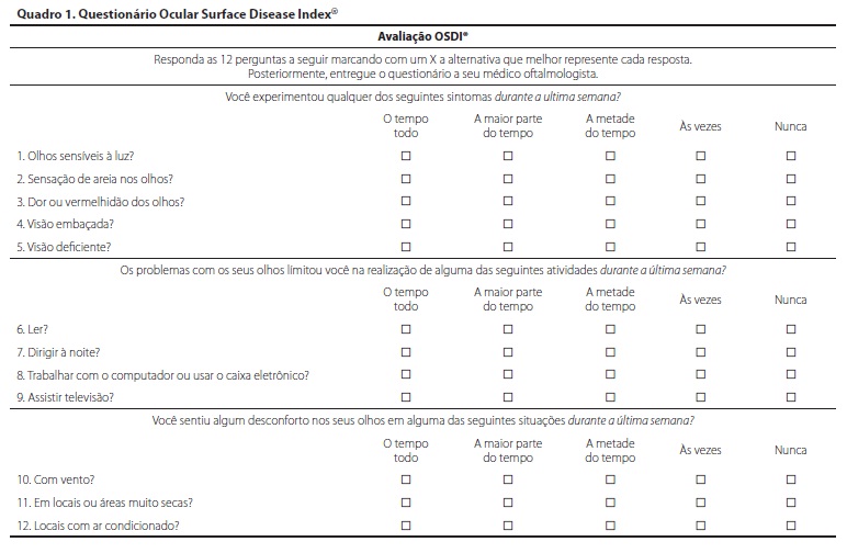 Não existe um consenso quanto aos critérios diagnósticos de OSD. Os testes e exames mais utilizados na avaliação da superfície ocular são: biomicroscopia, testes de Schirmer, avaliação da superfície ocular com corante rosa Bengala, fluoresceína ou lisamina verde, avaliação do TRFL, análise bioquímica do filme lacrimal e citologia de impressão da córnea e conjuntiva(22). Para avaliar o impacto na qualidade de vida e permitir a padronização das queixas dos pacientes, são disponíveis diversos questionários, como o questionário desenvolvido por McMonnies(23), o questionário "Visual Function Questionnaire"(VFQ-25) desenvolvido pelo "National Eye Institute"(24) e o OSDI® elaborado pela companhia Allergan. O último se destaca por ter sido validado através de testes psicométricos e por ter sido aprovado pelo FDA (U.S. Food and Drug Administration) para uso em ensaios clínicos(12,25,26).