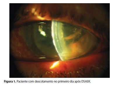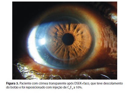 As vantagens do transplante endotelial foram amplamente difundidas e relatadas nos últimos anos(16,25-28). Apesar de todas as vantagens, existem complicações relacionadas a este procedimento e uma curva de aprendizado. As principais complicações incluem descolamentos e falências do enxerto(16,25-28). Suas prováveis causas incluem presença de viscoelástico, fluido ou ar na interface, trauma excessivo do botão doado e problemas com o preparo e inserção do botão doado(16,25-28).