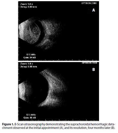 A satisfactory recovery of visual acuity is not always achieved after medical or surgical treatment of suprachoroidal hemorrhage(3). Some authors emphasized that early diagnosis and the adjustment of anticoagulant therapy have an important role in the medical treatment and control of the eye and systemic disorders(6). In our case, complete recovery was achieved due to early diagnosis and treatment.