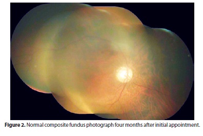 Right eye visual acuity was 20/50 and 20/20 after two and four months, respectively. Except the immobility of the pupil initially observed, all the pathological bleeding had disappeared. B-scan ultrasonography and composite fundus photograph (Figure 1b and Figure 2) revealed resolution of the hemorrhagic detachment.