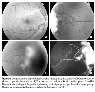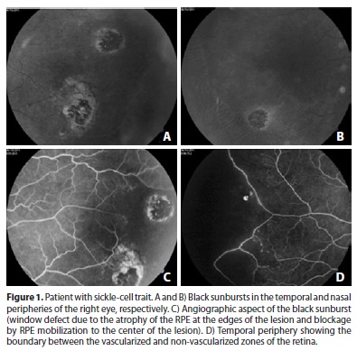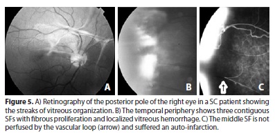 The hemorrhages are temporary, and those that occur in the posterior part of the eye are difficult to observe. Their late signs, such as iridescent bodies and black sunbursts, can be observed in approximately 25-40% of cases and are more frequent in SC hemoglobinopathy(5).