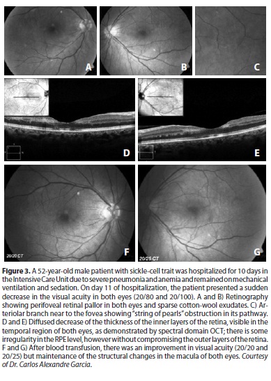 Individuals with sickle-cell trait comprise 8% of the African-Caribbean(11) population and over 10% of the Brazilian population(1). Although these individuals often show no relevant clinical manifestations, they may present various retinal changes such as hemorrhages, exudates, angioid streaks, acute chorioretinal infarction, chorioretinitis, vitreous hemorrhage, retinal vascular abnormalities such as tortuous/dilated retinal veins, microaneurysms, central retinal artery occlusion and retinal proliferation(11-14).