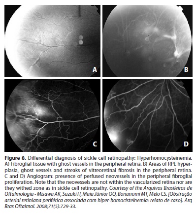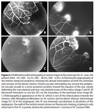 The peripheral retina, especially the temporal portion, is highly susceptible to the effects of intravascular sickling. Because it exhibits vascular network architecture of the terminal type with very thin vascular diameter, it is predisposed to occlusion. The events that lead to the occurrence of PSR typically begin in this region. Due to the insufficient number of capillaries, the collateral circulation is not developed when a vascular segment is occluded. The sequence of events was described by Goldberg(47). The recently blocked vessel can be occluded permanently and recanalized with or without the occurrence of salmon patch hemorrhage. The plugs of erythrocytes may leave the site in up to 12 hours, but remodeling of the vascular network takes months or years. If this remodeling process is efficient and forms new vascular arcades similar to normal ones, it eventually leads to the posterior formation of a peripheral capillary network (Figure 1D) without risk of sea fan development. If the remodeling is partial, an irregular vascular pattern that is more prone to neovascularization develops(48). The irreversible vascular occlusion in the peripheral retina characterizes Stage I of the process. The occluded segment can display a "silver wire" appearance, but the ischemic phenomenon is more easily observed by fluorescein angiography (Figure 4). Following these events, there is a tortuous elongation of the arteriole end and dilation of capillaries that form arteriovenous communications in the boundary between the vascular and ischemic retinas, characterizing Stage II. The neovessels are formed from these anastomoses and are derived from the venous side of the circulation(49). The presence of neovessels defines Stage III. Characteristically, the neovascular tuft occurs at the boundary between the non-vascularized and vascularized zones of the retinal periphery (Figures 4 and 5); the tuft is initially flat, with thin walls and located in the extreme periphery. The neovascular tuft is, therefore, difficult to diagnose ophthalmologically without a careful search, and angiography of the suspected sites can help in this process. The well-developed neovascular tissue exhibits a typical fan shape. This morphology was compared by Welch & Goldberg(23) to that of the marine invertebrate Gorgonia flabelum or sea fan (SF). Subsequently, a fibroglial tissue membrane develops on the SF, obscuring the blood column (Figures 4-6). At the same time, the SF tends to rise into the vitreous and form anastomoses, which leads to the emergence of large fibrous bands in the retinal periphery. The degree of perfusion of these lesions can be demonstrated by fluorescein angiography(25).