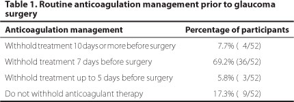 Keywords: Anticoagulants; Aspirin; Warfarin; Glaucoma; Cataract extraction; Perioperative period; Societies, medical; Questionnaires