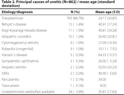 Uveitis was the second most common cause of visual impairment (862 patients; 15.8%) and toxoplasmosis was the most frequent clinical diagnosis in the uveitic group (765 cases; 88.7%), followed by Behçet disease (12 cases; 1.4%), Vogt-Koyanagi-Harada disease (11 cases; 1.3%), idiopathic choroiditis (10 cases; 1.2%), cytomegalovirus retinitis (9 cases; 1.0%), rubella (9 cases; 1.0%), Hansen´s disease (3 cases; 0.3%), sympathetic ophthalmia (3 cases; 0.3%), herpetic retinitis (2 cases; 0.2%), syphilis (2 cases; 0.2%), pars planitis (1 case; 0.1%) and toxocariasis (1 case; 0.1%). Thirty four patients (3.9%) had uveitis of undetermined etiology and/or unavailable classification, as seen in the table 2.