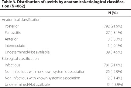 According to the anatomical classification we found 792 (91.9%) posterior uveitis, 27 (3.1%) panuveitis, 3 (0.3%) anterior uveitis, 1 (0.1%) intermediate uveitis and 39 (4.5%) undetermined and/or not available classification. According to the etiological classification, 791 (91.8%) were infectious uveitis, 25 (2.9%) non-infectious uveitis, 12 (1.4%) non-infectious associated with systemic disease and 34 (3.9%) undetermined uveitis and/or not available classification, as seen in the table 3.