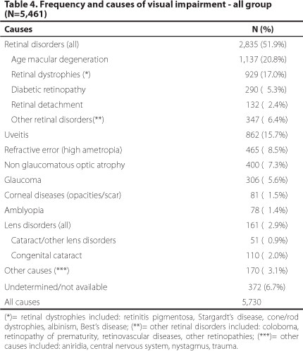 The frequency and distribution of visual impairment causes found from the 5.461 patients are presented in the table 4. Two hundred and sixty nine patients presented more than one cause of visual impairment, thus the total for the causes exceeds the overall of patients. The main causes of visual impairment were: retinal disorders (51.9%), uveitis (15.7%), refractive error (8.5%), optic atrophy (7.3%) and glaucoma (5.6%).