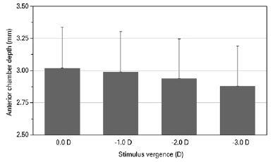 Results: Central corneal thickness was not altered at any stimulus vergence during accommodation (p>0.05). Conversely, anterior chamber depth was significantly reduced (p<0.05), whereas central lens thickness was significantly increased (p<0.05). Anterior segment length also increased with accommodation (p<0.05), indicating backward movement of the posterior pole.