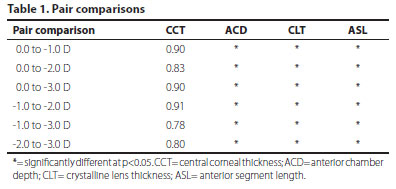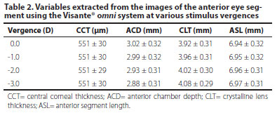 Table 1 shows the p-values of all stimulus comparisons for every studied parameter and thus all of the statistically significant differences that were found. Table 2 shows all of the results (mean ± standard deviation) extracted from the images of the anterior eye segment using Visante® omni at all stimulus vergences, namely 0.0, -1.0, -2.0, and -3.0 D.