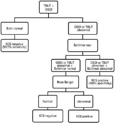 Second, if the OSDI questionnaire and/or TBUT results are abnormal, the Schirmer I test must be performed for all patients. A positive Schirmer I test confirms the KCS diagnosis. In distinct well-defined conditions, the combination use of the OSDI, TBUT, and Schirmer test was the best combination to detect DED(30).