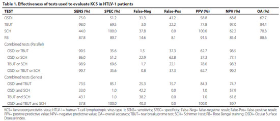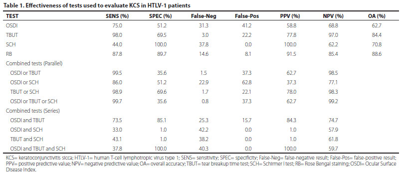 Methods: Ninety-six patients infected with human T-cell lymphotropic virus type 1 were enrolled in the study. To assess clinical complaints, patients completed the Ocular Surface Disease Index questionnaire. To evaluate lacrimal film quality, patients underwent the tear breakup time test, Schirmer I test, and Rose Bengal staining. Dry eye disease was diagnosed when at least two of the three test results were abnormal. The sensitivity, specificity, positive and negative predictive values, and overall accuracy of the questionnaire as well as of each test alone and combined in parallel and in series were determined.