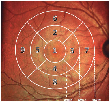 Measurements were taken according to the guidelines of the respective device manufacturers. Before imaging, all eyes were subjected to an ocular examination including visual acuity testing, auto-refraction, intraocular pressure, and ophthalmoscopic examination. After enrollment, all eyes were imaged without mydriasis. Three repeated measurements were performed within a short period of time on the same day by a single examiner (EC) to test the intraobserver repeatability. The first examination was marked as the reference in the follow-up mode, a special feature of the Heidelberg SD-OCT system that allows scanning of the same part of the retina during follow-up visits. SD-OCT imaging was also performed once by another examiner (MCS) on the same day to test interobserver reproducibility. The thicknesses of all layers within the central ETDRS zones of 0-1000 and 1000-3000 µm (inner ring) and 3000-6000 µm diameter (outer ring) were recorded for each scan (Figure 2).