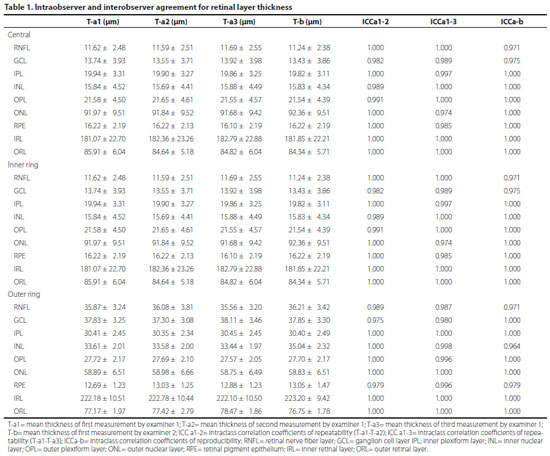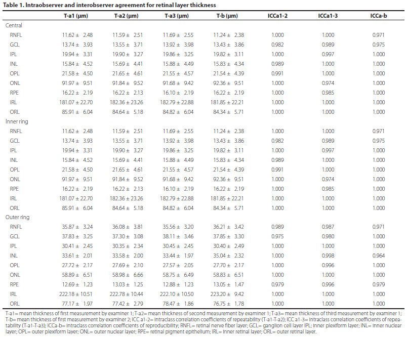 Repeatability and reproducibility are very important for assessing measurement fluctuations for an instrument and when an instrument is used by multiple operators. Measurements of the intraretinal layers are significant morphometric parameters in the diagnosis of retinal and neurological diseases as well as for monitoring disease progression(13). In this study, we evaluated the repeatability and reproducibility of measurements for nine intraretinal layers (RNFL, GCL, IPL, INL, OPL, ONL, RPE, IRL, ORL) determined by an automated algorithm applied to images obtained using the SD-OCT system with the follow-up mode. The follow-up mode is also called AutoRescan and implements active eye tracking to perform OCT scans automatically on the retina at the same point as in the previous review(14). In our study, for both intraobserver and interobserver comparisons, ICCs were high for all layers. The intraobserver and interobserver test results indicated that the SD-OCT system produced excellent repeatable and reproducible measurements for all of the intraretinal layers. The repeatability of measurements in the present study is consistent with those in previous reports involving different OCT devices.