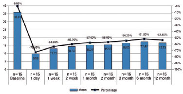The mean IOP values were significantly lower than the preoperative values at all postoperative visits (p<0.001; Figures 4-5). The mean number of antiglaucomatous medications was 3.60 ± 0.50 in the preoperative period; at 1 year after surgery, the mean number of antiglaucomatous medications had decreased to 0.33 ± 0.90 (p<0.001). At the end of the follow-up period, only two patients (13.3%) required antiglaucomatous treatment. In one patient, the stent was removed because it prolapsed into the anterior chamber, and antiglaucomatous treatment was started 12 months after surgery. None of the patients required further glaucoma surgery.