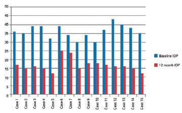 Results: The mean IOP values were significantly lower than the preoperative values at all postoperative visits (p<0.001). In two patients, the IOP exceeded 20 mmHg 12 months after surgery. These IOP increases were controlled by medical therapy, and none of the patients needed another surgical procedure.