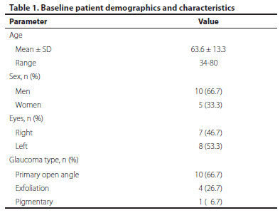 A total of 15 eyes of 15 patients were investigated in the study. Tables 1-2 show the baseline patient demographics, characteristics, and findings. Three patients (20%) previously underwent incisional glaucoma surgery. Of the 15 patients examined, nine (60%) underwent only XEN45 gel stent implantation surgery, with six (40%) undergoing XEN45 gel stent implantation combined with cataract surgery. There were no complications related to cataract surgery.