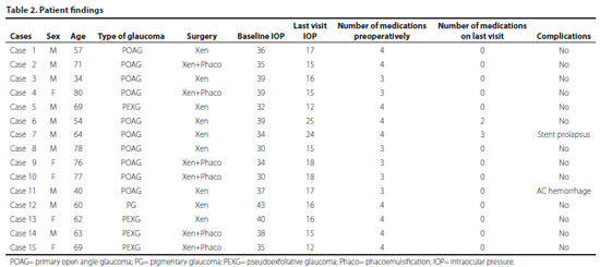 Because the XEN45 gel stent is a new device, there are few articles to date about its implantation in the literature(16-18). Previous authors(17) performed XEN45 gel stent implantation with mitomycin C injections combined with cataract surgery in 30 eyes. They achieved a significant IOP reduction (29.34%) after 12 months of follow-up. At the end of the follow-up period, three patients required antiglaucomatous treatment. The most common complications were hemorrhage at the scleral exit point (90%) and minor intracameral hemorrhage (86%). No vision-threatening complications were observed.