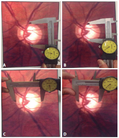 For color retinography, the largest horizontal and vertical optic disk diameters were obtained from the inner edge of the Elschnig ring, measured by means of a Mitutoyo caliper (Mitutoyo South American LTDA, Santo Amaro, SP, Brazil), regulated within 0.01 mm. The image from this examination was enlarged proportionally in a tablet with a retina screen (iPad 2, Apple, Cupertino, CA, USA). Initially, the greatest vertical length for the optic disk was obtained by placing the rods of the caliper between the edges of the Elschnig ring. Next, the size of the vertical cup for which the rods of the caliper showed the longest length was measured, delimited by the emergence location of major blood vessels (Figure 1). After obtaining the vertical measurements, the same procedure was performed for the horizontal measurements. The horizontal and vertical CDRs were obtained by simple division. To read the caliper measurement, the value in millimeters was read from the millimeter ruler, and the decimal value was read from the analog clock. Both examiners evaluated the retinography images together, but the same examiner used the pachymeter to perform all cup measurements after agreement between the two, masking the results obtained with the RTVue OCT.