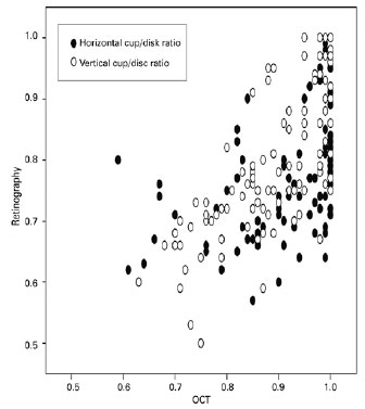 Methods: This is a cross-sectional study performed with digital retinography and RTVue OCT images from patients with glaucoma or patients suspected of glaucoma. In color retinography, the greatest horizontal and vertical diameters of the optic disk starting from the inner edge of the Elschnig ring were obtained using a pachymeter with a grade of 0.01 mm. In OCT, the delineation of the optic nerve was obtained automatically from the horizontal and vertical cup results.