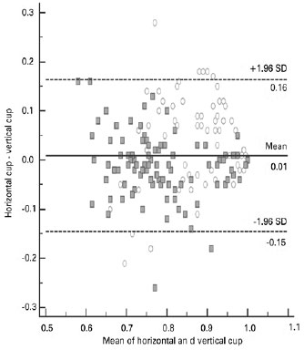 The Bland-Altman plot (Figure 3) was used to assess the agreement between the methods. There was poor agreement between the methods, both for the horizontal cup (kappa: 0.034, p=0.02) and the vertical cup (kappa: 0.058, p<0.001).