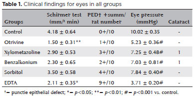 Métodos: Sessenta ratos Wistar adultos machos foram divididos aleatoriamente em seis grupos. Os primeiros dois grupos foram controle (soro fisiológico) e Otrivina®. Os quatro grupos restantes receberam os excipientes de Otrivina, tais como Xilometazolina, Benzalcônio, Sorbitol e Ácido Etilenodiamino Tetracético (EDTA). Os medicamentos foram aplicados em ambas as narinas dos ratos, duas vezes ao dia, durante 8 semanas. Antes que os ratos fossem sacrificados, a coloração epitelial, o teste de Schirmer e a medida da pressão intraocular foram realizados sob anestesia com Ketamina/Xilasina (50 e 5 mg/kg, respectivamente).