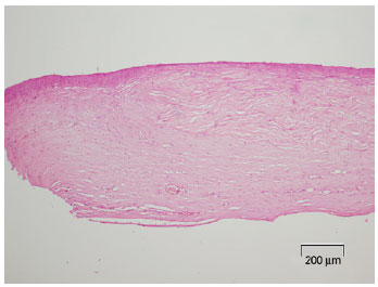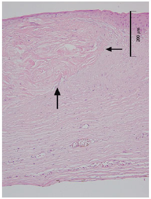 The excised 7.0-mm corneal button was examined histologically (hematoxylin-eosin staining) (Figure 2). The corneal epithelium was continuous, completely covering both the cornea and the scleral graft. The embedded scleral graft was well adapted. Irregular arrangement of the scleral collagen fibers was completely distinct from the characteristically regular corneal stromal collagen architecture (Figure 3). Numerous blood vessels were present, reaching both the peripheral and central parts of the deeper layers of corneal tissue. The break in Descemet's membrane was clearly visible (Figure 4).