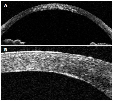We performed Visante optical coherence tomography (OCT)® (Carl Zeiss Meditec, Dublin, CA, USA) which showed hyperreflective granules from the Bowman's layer to the deep stromal lamellae, indenting the DM in some areas (Figure 2 A).