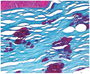 The dissected stroma was sent for anatomopathological analysis with Masson trichrome staining and showed stained hyaline deposits at various stromal layers, confirming diagnosis of GCD1 (Figure 3).