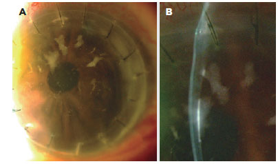 Post-operative anterior biomicroscopy with scleral scattering illumination showed persistence of whitish granules in the recipient's cornea (Figure 4 A), which were identified as being anterior to the DM and posterior to the donor cornea using a slit lamp (Figure 4 B). Visante® OCT was performed one month post operatively and showed hyperreflective opacities between the donor cornea and the recipient's DM, demonstrating persistence of dystrophy deposits inside the predescemetic layer (Figure 2 B). Her BCVA improved to 20/60 in the first month even with opacities near the visual axis.