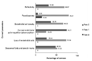 Methods: A retrospective review of all corneal tissues preserved by the Sorocaba Eye Bank from January to April of 2014 was performed. All donated corneas classified as tectonic were included. Endothelial tissue was defined as healthy and viable for posterior lamellar keratoplasty if endothelial cell density was ≥2000 cells/mm2. Additional parameters analyzed included Descemet folds and stretch marks, loss of endothelial cells, corneal endothelial polymegathism/ pleomorphism, pseudo-guttata, and reflectivity.