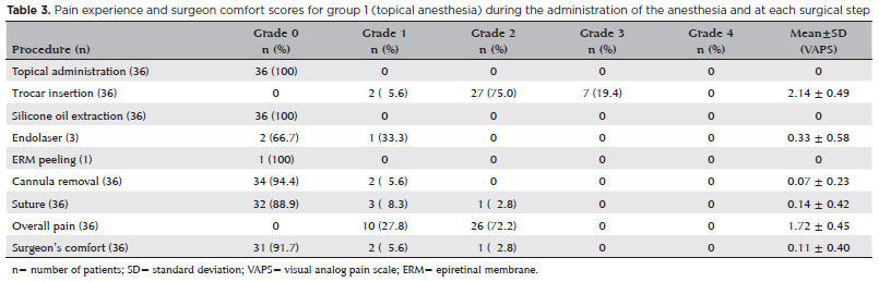 Methods: We selected patients according to their behavior during previous vitreoretinal surgery and ophthalmologic examinations and divided them into two anesthesia groups: topical (n=36) and retrobulbar (n=33). We used a mixed technique for the passive removal of silicone oil in both groups. During each step of the surgery, the patients' pain experience and the surgeon's comfort were scored according to a pain scale.