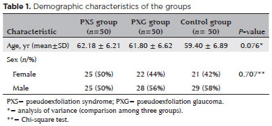 The mean age of the 25 male (50%) and 25 female (50%) patients with PXS was 62.18 ± 6.21 years (range, 35-70 years); the mean age of the 28 male (56%) and 22 female (44%) patients with PXG was 61.80 ± 6.62 years (range, 35-70 years); and the mean age of the 29 male (58%) and 21 female (42%) control subjects was 59.40 ± 6.89 years (range, 47-70 years). There were no statistically significant differences between the groups in mean age or sex ratio (p>0.05). Patient characteristics are shown in table 1.