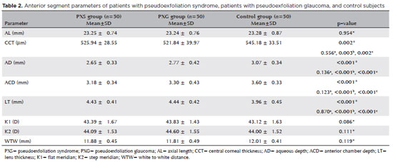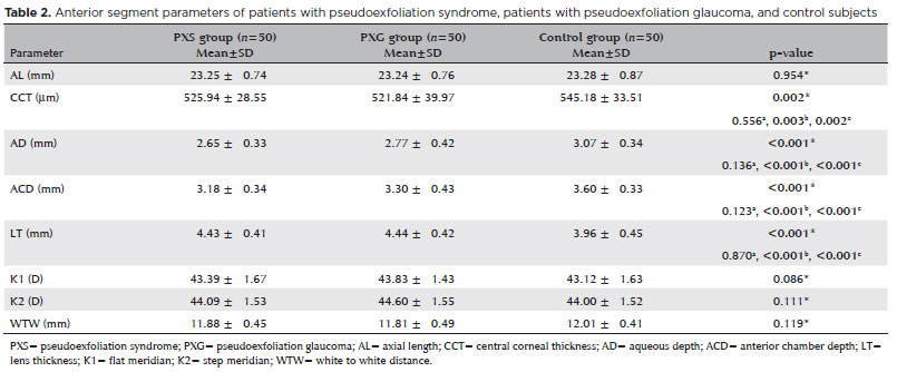 Métodos: O presente estudo prospectivo comparativo controlado incluiu 150 olhos de 150 pacientes. Os pacientes foram divididos em três grupos: grupo síndrome de pseudo-esfoliação, grupo glaucoma pseudo-esfoliação e grupo controle (50 em cada grupo). O comprimento axial, a espessura corneana central, a profundidade aquosa, a profundidade da câmara anterior, a espessura da lente, os valores de ceratometria K1 e K2 e as medidas branco a branco, obtidas por biometria óptica, foram comparados entre os grupos.