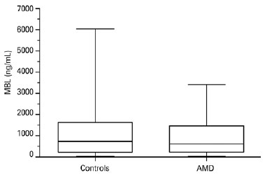 Several eye diseases, such as glaucoma, diabetic retinopathy, and uveitis, appear to be linked to some type of immune deregulation(17). The activation of the complement cascade by the classical, alternative, or LP, produces inflammatory mediators and leads to target cell damage by the membrane attack complex(17). A low level of complement activation constantly occurs in the eye and is probably needed for protection against pathogens. To regulate and control excessive complement activation that would be damaging to the tissue, ocular fluids and cells express a number of complement regulatory proteins(18). It has been well-established that complement activation has a role in AMD, particularly regarding AP, which is related to polymorphisms of the human factor H gene(19-21). To our knowledge, there is no information on the role of LP in AMD. However, at least in a mouse model, low expression of LP components in retinal tissue was observed and the whole complement system was required for the development of AMD, particularly the exudative form(22,23). Additionally, LP is apparently involved in the lysis of RPE cells in vitro(8). In the present study, serum MBL levels did not differ either between patients with AMD and controls or between exudative and nonexudative forms of AMD. Similar results were found in a study from Australia(24). It is important to emphasize that this Australian study had the same exclusion criteria, AMD definition and plasma MBL levels. The MBL levels obtained for controls were 739 ng/mL in Brazil and 720 ng/mL in Australia (median); the MBL levels in patients with AMD were 608 ng/mL in Brazil and 740 ng/mL in Australia.