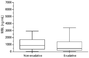 In conclusion, serum MBL levels did not significantly differ between patients with AMD and controls or between exudative and nonexudative forms of AMD. These results suggest that MBL does not play a major role in the development of AMD or in its clinical presentation.