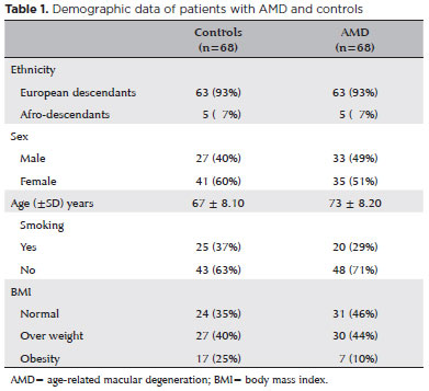A total of 136 participants were included in this study. The AMD group included 68 participants (63 European descendants and five Afro-descendants; 33 men and 35 women), including 34 with exudative and 34 with nonexudative clinical presentations (Table 1). The control group included 68 participants (63 European descendants and five Afro-descendants; 27 men and 41 women) without identifiable eye disorders. There was no significant difference in age, sex, or BMI between the groups. In the AMD group, 37 (54%) patients had BMI >25 kg/m2, and in the control group, 44 (65%) had BMI >25 kg/m2. Smoking habits were similar in both groups (Table 1).