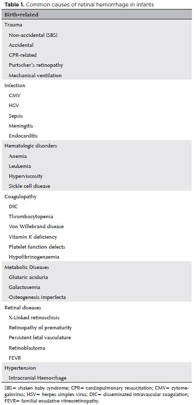 We did a systemic work-up to rule out other causes of retinal hemorrhage, such as accidental or non-accidental injury or hematological and cardiovascular disorders; we found no other abnormalities. The causes of retinal hemorrhage considered in the differential diagnosis are listed in table 1.