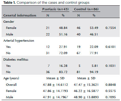 We identified a potential 214 patients for inclusion in the psoriasis cohort. However, only 43 attended their consultations, with non-attendance resulting from the presence of exclusion criteria, lack of interest in participating in the study, inability to contact the patient, or change of residence to other cities and states. The participants included 21 women (48.84%) and 22 men (51.16%), with a mean age of 47.88 ± 14.61 years. The control group included 86 volunteers. The details of the two groups are summarized in table 1.